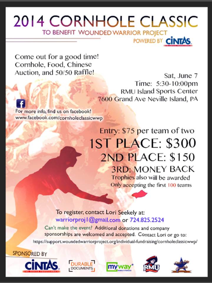 Ok… here’s the deal. Our buddies at Cintas are holding this cornhole fundraiser. We need everyone to go. But, if you think you have a partner and you can win this thing (or simply go and have a good time) comment below.