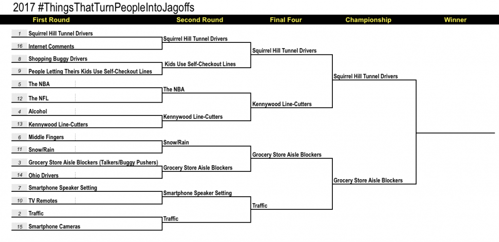 Well! Here we are! The Final Round. Last year’s winner, Squirrel Hill Tunnel Drivers is back in the champeeeenship! And somehow Grocery Store Aisle Blockers made it! Go vote! Tell your friends and enemies to vote! The champion will be revealed on Friday!