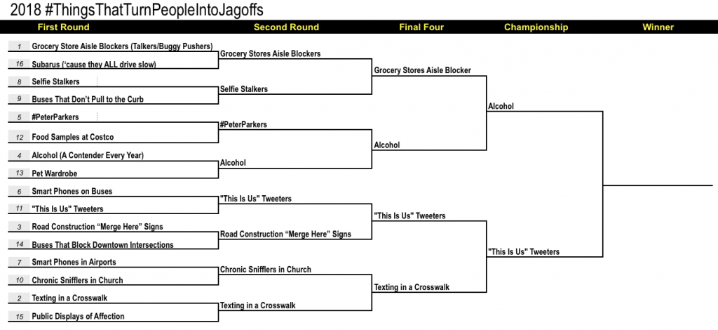 Vote here for the Championship matchup between #4-ranked seed, Alcohol vs. the #11-ranked seed, “This Is Us” Tweeters!