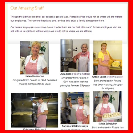 Look at this pic of some of the Pierogies Plus staff… they could all be your grandmother, aunt, uncle, etc. They’re all so damned CUTE! (See the entire staff photos here)