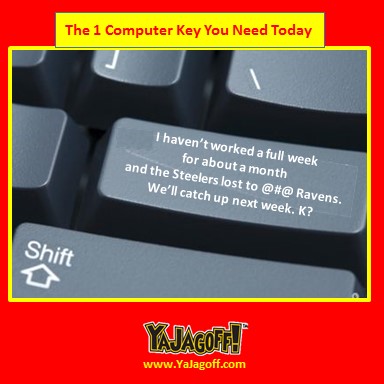 Some of you haven’t worked a full week of actual work for about 2-3 weeks. Today, you are faced with Monday and, more than likely a 5-day work week. On top of that, there’s no Steelers football, thus, no Black-and-Gold and Pot-Luck Friday (i.e, a day of work that is not really a day of work because you’re too busy coordinating the crock pot and veggie tray set-up and tear-down). So, the keyboard button above can be utilized as needed.