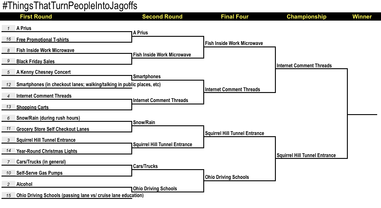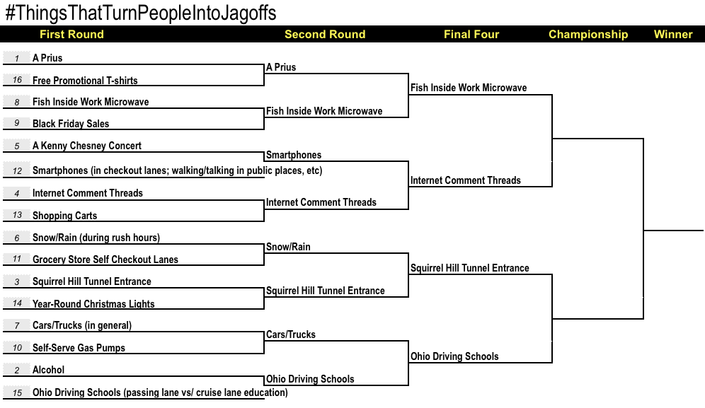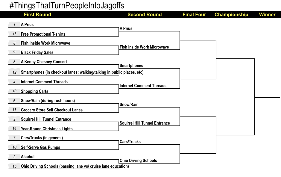 OK… everyone in the world does some kind of bracket contest sooooooo I’m gonna do that too. Bracket title: #ThingsThatTurnPeopleIntoJagoffs ...