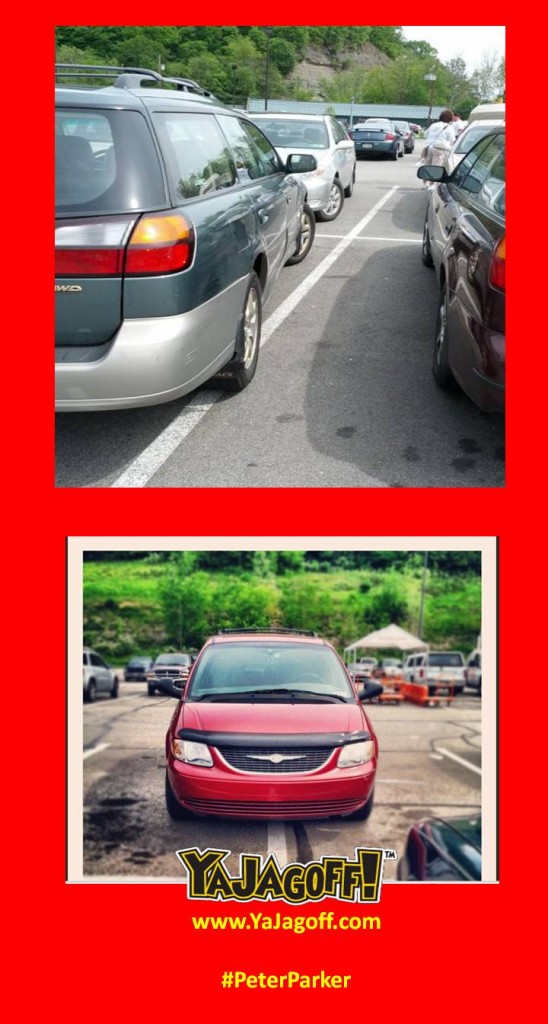 Now these most recent pics (above) REALLY confuse us. In the pics above, you’re looking at a mini-van and a Subaru that have no concept of those things called “white lines” in the parking lot. As a matter of fact, it looks like the mini-van thought it was the “centering point” for parking. (Maybe the driver’s an airpline pilot??)