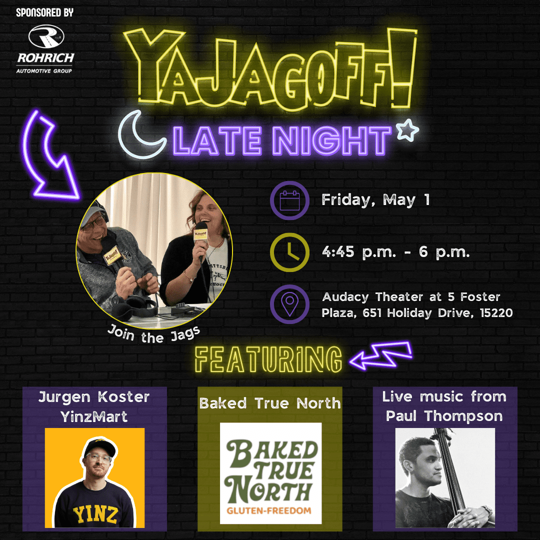 Want a sneak peek of the podcast? Be part of the experience and take a seat in the audience for a live recording! Join the Jags and our unique guests for a night of food, fun and all things Pittsburgh. Grab a photo with your favorite Yinzers and spend your happy hour every Friday with a bunch of Jagoffs, ya Jagoff!