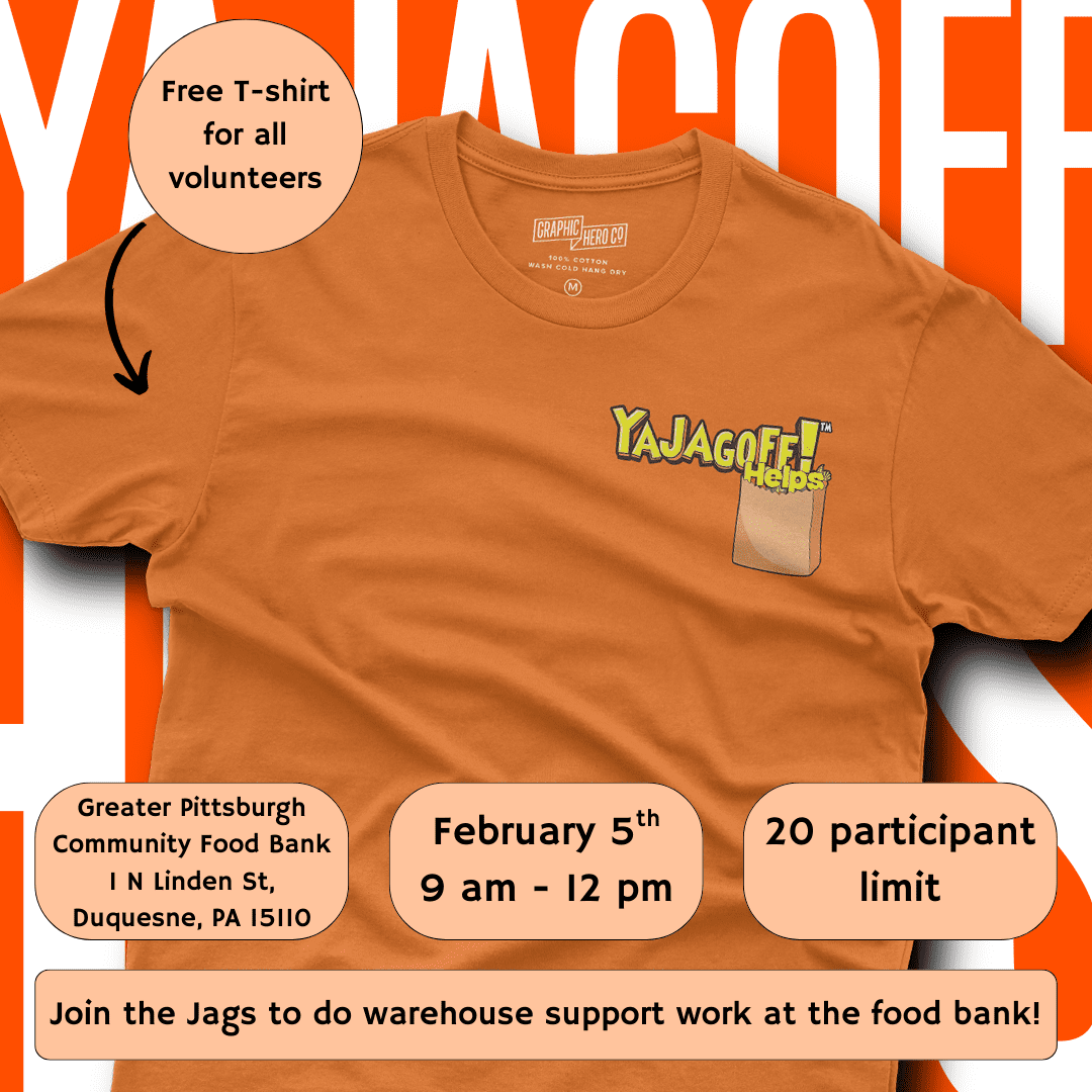 Join the Jags to do volunteer warehouse support work at the Greater Pittsburgh Community Foodbank. What’s it get ya? A special T-shirt. Who’s in? Register ...
