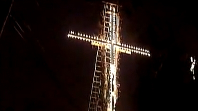 This guy’s havin’ a spat with his neighbor and decides to erect a HUMONGOUS, IMPOSING, LIGHTED-LIKE-A-CASINO cross on his property to “show his faith!” He actually goes on the tube sayin’ he’s got a calling from the Lord to show his faith.  Sheeesh!!!