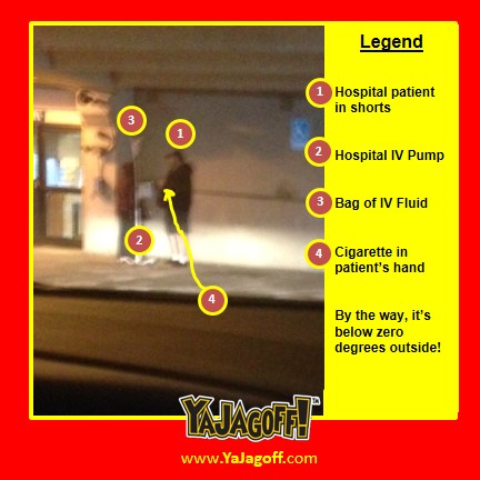 On the other hand, this picture shows the dedication a smoker might have… sub-zero weather, in shorts and a t-shirt and IV fluid running through a pump (and I doubt the IV has anti-freeze in it.)
