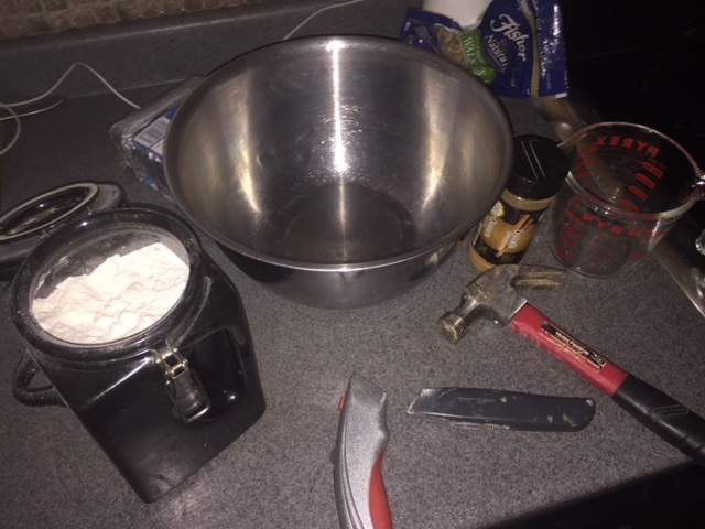Ya have to start off the the right tools. When I’m baking, ya never know what will break so I keep tools handy. Not that I know how to use them any better than a spatula but…they are good to have close at hand. The linoleum knife came in handy for opening the bag of walnuts.