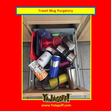 The purge usually occurs after everyone has turned a blind eye to the gradually mounting collection of travel mugs and then gets ticked off when the drawer keeps jamming on that one mug that just won’t push down into the @#@*ing drawer.