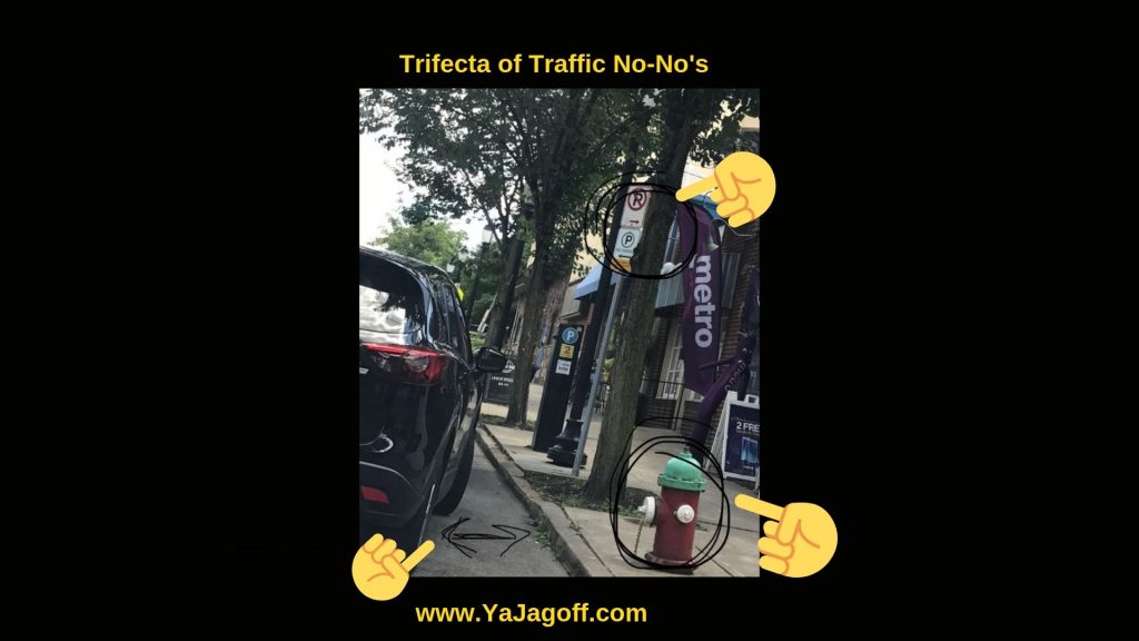 To top off the triangle of wrongdoings, sister was not quick about her illegal parking position.  She chatted with some friends, stood on the street and smoked a cig.  There ya have it. The parking villain just made it all worse.  No urgency. No emergency.  Nope, just the need to create an illegal parking spot.  The silver lining?  A visual demo of what not to do for the next driving lesson with my son.  Thanks for the real-life example, ya jagoff.