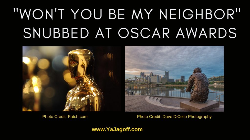 So go ahead Hollywood.. have your parties with fake body parts, smiles and poorly written award-ceremony jokes with no host. Go ahead with your silly muscle-man statue. Go ahead and snub, not just the Mr. Rogers legacy… but all of Pittsburgh. The negative karma of this is kinda like stepping on at Terrible Towel so look out Ya Jag… oh wait… what would Mr. Rogers say about name-calling or being angry?